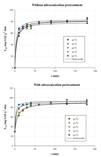The optimization of the extraction process revealed significant changes in the extraction variables as a consequence of ultrasonication pretreatment, but to portray the ultrasound effect on the process in an integrated frame, information pertaining to the kinetics of the extraction and the effect of temperature was indispensable. Towards this objective, extraction kinetics were traced over a wide breadth of temperatures, ranging from 40 to 80 °C (Figure 5). In each case, the optimized conditions were used to carry out the extractions (Table 5). A modification of a previously proposed kinetic model was employed for both non-pretreated and ultrasound-pretreated samples [34]: