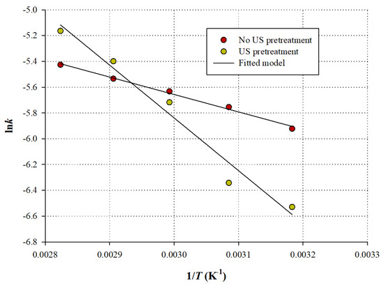 Arrhenius plot for the extractions with no pretreatment (No US) and ultrasonication pretreatment (US).