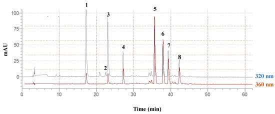 HPLC traces of the sample extracted under optimal conditions, at 80 °C, with ultrasonication pretreatment, recorded at 320 and 360 nm. Peak assignment: 1, neochlorogenic acid; 2, chlorogenic acid; 3, chlorogenic acid isomer; 4, multiflorin B; 5, quercetin glucoside; 6, quercetin manonylglycoside derivative; 7, kaempferol glucoside; 8, kaempferol malonylglucoside.
