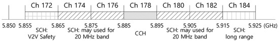 As shown in the figure, Channel 178 (5.885 GHz–5.895 GHz band) is called the Control Channel (CCH), which is used only for safety messages and control messages. Channel 172 (5.855 GHz–5.865 GHz band) is dedicated to safety messages between vehicles, and Channel 184 (5.915 GHz–5.925 GHz band) is used to transmit frames to vehicles in a long communication range. The remaining channels can be used to send data frames regardless of message or data type. Two sets of 20-MHz channels (Channel 174 and Channel 176, and Channel 180 and Channel 182) can be used for 20-MHz frame transmissions.