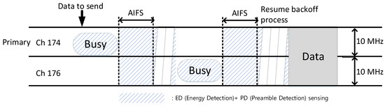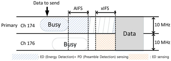 As in the conventional AIFS method, channel sensing in the primary channel can be performed with PD and ED sensing. In the proposed modification, since the modified conventional wideband channel access scheme only requires one transceiver, ED-based channel sensing can only be used in the secondary channel because PD sensing in the secondary channel is not general. When a busy channel is detected with ED sensing in the secondary channel, the busy-channel duration cannot be known. Therefore, in order to minimize the impact of 20-MHz frame transmission using the secondary channel and protect the ongoing frame transaction (i.e., data frame + ACK) of the secondary channel, a relatively long waiting period of the EIFS duration must be applied. The rest of the channel access procedure after the back-off operation is conducted as in the conventional AIFS-based wideband channel access method.