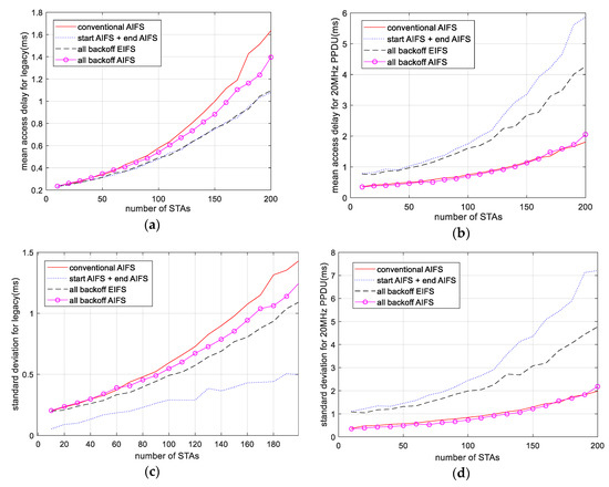 Figure 9a,c, the proposed 20-MHz channel access scheme, the all back-off AIFS scheme, provides the minimum impact on the medium access delay of 10-MHz frames transmitted in the secondary channel in terms of mean and standard deviation. The standard deviation of all back-off AIFS scheme provides smaller standard deviation than the conventional method, providing the minimum impact on the number of 10-MHz transmissions with high contention delay caused by 20-MHz transmissions. Since all back-off AIFS has good performance in terms of the medium access delay of 10-MHz transmission, it will be beneficial when delay sensitive data are transmitted using 10-MHz bandwidth in V2X applications. Thus, the proposed scheme provides the maximum fairness with 10-MHz frame transmissions in the secondary channel.