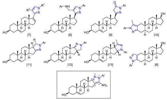Some previously synthesized androstane-based pyrazol(in)es with anticancer activity [6,7,8,9,10,11,12,13] and 5-amino-1-arylpyrazoles (framed), which are the subjects of the present study.