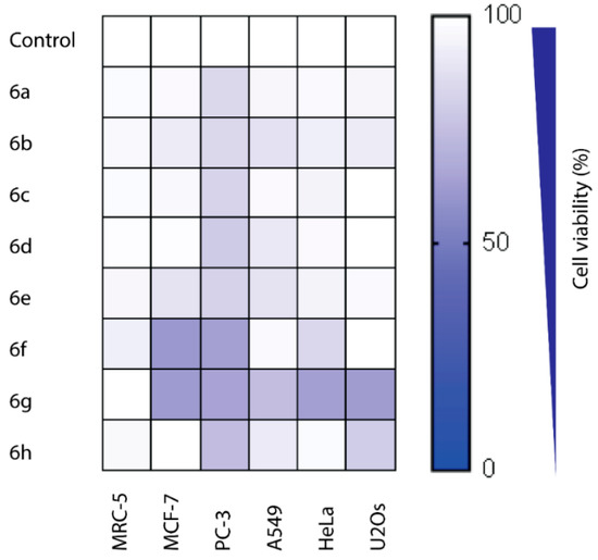 In order to screen the cancer cell-specific antiproliferative effect of the synthesized D-ring-fused steroidal 5-aminopyrazoles (6a–h), various human cancerous cell lines, namely MCF-7, PC-3, A549, HeLa and U2Os cells and MRC-5 noncancerous fibroblasts were treated with the test compounds in 5 µM concentration for 72 h. A heat map (Figure 3) was constructed based on the obtained viability data (Supplementary Material, Table S1). It was found that compound 6g showed the most prominent antiproliferative activity and proved to be efficient on all the tested cancer cells. The other compounds exerted minor or fair cytotoxic effects and their cancer-specific antiproliferative features were much less pronounced than that of 6g.