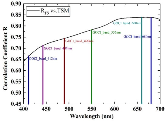 Correlation coefficient spectra between total suspended matter (TSM) and Rrs(λ) in the range of 400–700 nm.