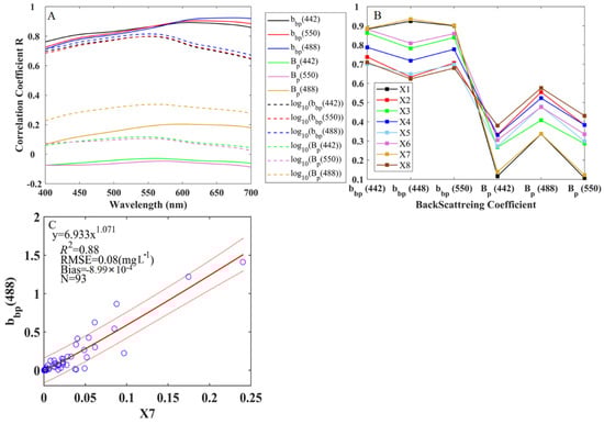 (A) Correlation coefficient spectra between Rrs(λ) and bbp(λ) and log10(bbp(λ)) in the range of 400–700 nm; (B) correlation coefficients between bbp(λ) and eight band combination forms (X1 to X8), which are the same as those in Figure 4. (C) Scatter plots of X7 (i.e., (Rrs(555) + Rrs(660))/(Rrs(555)/Rrs(660))) and bbp(488) using a power function; the solid red lines are the fitted function curves, and the dotted red lines are the 95% confidence bounds.