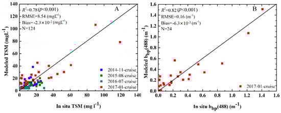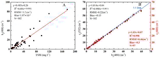 Relationships (A) between TSM and bp(488), and (B) between bp(488) and cp(532) and cp(555), which were observed in January 2017. These close relationships all show a very high confidence level, with p < 0.001.
