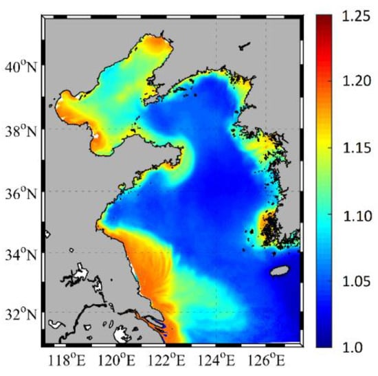 Regarding the offshore areas, the np values in the BS were higher than those in the YS. This is because the BS is prone to sediment resuspension under the action of wind waves due to its relatively shallow depths [50,51]. Song et al. (2014) [52] demonstrated that inorganic minerals and silts controlled the suspended particles in the BS. Therefore, those hard mineral and sediment particles may explain the high np values in the BS (except those nearshore regions), which were mainly in the range of 1.10–1.15 (Figure 10) [2,5,53]. Fortunately, the derived np distributions generally agree with the previous report [5]. By contrast, the YS waters (except those nearshore regions) are easily affected by algal particles, where diatoms and dinoflagellates are the main algal species [54,55,56]. Importantly, these algal particles generally show a relatively low bulk refraction (approximately 1.01–1.07) due to their high water content [57,58,59]. Therefore, the low refraction distribution in most regions of the YS (i.e., np < 1.07, see Figure 10) can be attributed to the dominance of organic algal particles.