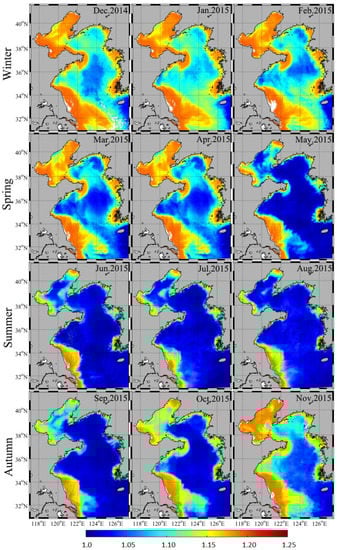 We could produce hourly np products by applying the developed model into the hourly GOCI Rrs(λ) data. Those hourly products were then synthesized into daily, monthly, seasonally, and annually averaged products. As shown in Figure 10, the general distribution pattern for 2015 is available. High np values generally dominated nearshore waters, while low values were mainly distributed in the offshore waters. The whole BS region usually had relatively high refraction values of approximately >1.10, whereas most areas in the YS, except coastal regions, showed low values (roughly <1.05). Note that a large water region that includes Subei shoal and the Yangtze River estuary appeared to have very high refraction, which even exceeded 1.15 for some areas.