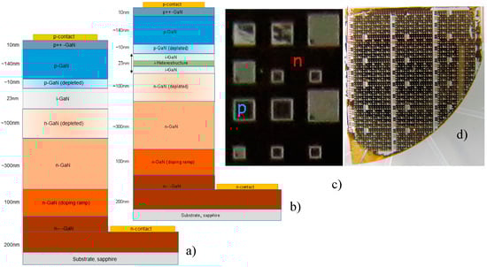 Figure 1. Schematic side-view representation of PIN-diodes based on (a) the GaN reference and (b) the InGaN/GaN and InAlN/GaN DHS; (c) distant and (d) close top-view photo of the PIN-diodes.