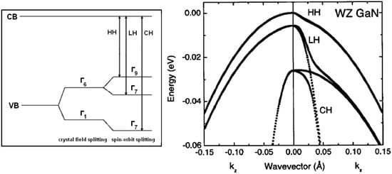 Figure 3. (left) Crystal field and spin–orbit interaction in wurtzite GaN [33,61,62,63,64] leading to the sub-bands of heavy (HH), light (LH), and crystal-field split-off holes (CH); (right) valence band structure of wurtzite GaN with three-split valence bands reproduced from [64] with the permission of AIP Publishing (in the wurtzite structure, crystal-field splitting appears due to the structural anisotropy parallel and normal to the c-axis).