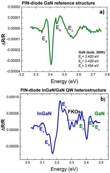 Figure 4. ER spectra of PIN-diodes based on (a) the GaN reference sample and (b) the In0.055Ga0.945N/GaN DHS with three-split valence bands Ea, Eb, and Ec of the wurtzite crystal structure.