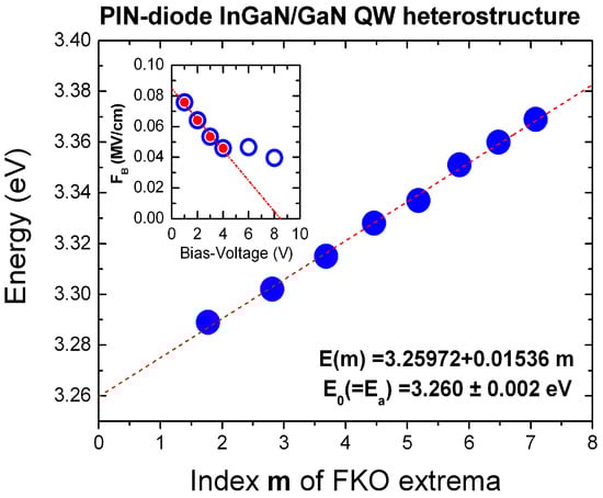 Figure 5. Linear fitting of the Franz–Keldysh oscillation (FKO) extrema of the ER spectrum of the In0.055Ga0.945N/GaN DHS of Figure 4b (inset: electric field in the barrier and depletion region interface in dependence of bias-voltage).