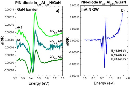 Opposite to the InxGa1-xN/GaN DHS with shallow well/high barrier, in case of the InxAl1-xN/GaN DHS with deep well/shallow barrier, no Franz–Keldysh oscillations were observed. The Ea, Eb, and Ec transition energies of the GaN barrier showed instead a remarkable dependence on the applied modulation voltage in the range of 2–6 V AC, as depicted in Figure 8a. An ER spectrum with good resolved transitions between the three-split valence band and the conduction band of InxAl1-xN was recorded only in case of the PIN-diode based on the In0.21Al0.79N/GaN DHS with the maximum of the investigated indium fractions of 21% In; the respective transition energies of Ea = 3.695 eV, Eb = 3.723 eV, and Ec = 3.748 eV can be evidenced in Figure 8b. An approximated value of the polarization field in the quantum well and the barrier interface can be deduced directly from the measured Ea energy as E p o l W = Ea/dQW = 3.695 V/4 nm = 9.24 MV/cm and E p o l B = Ea/du = 3.695 V/23 nm = 1.61 MV/cm, respectively. The mean value of Epol = 5.42 ± 1.63 MV/cm obtained by ER is in excellent agreement with the value determined by CVM as Epol = 5.1 ± 0.8 MV/cm [45]. Line-shape analysis of the ER spectra would exceed the objectives of the present work.