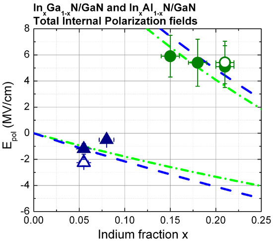Figure 9. Comparison of the polarization field values Epol of In0.055Ga0.945N DHS (open triangle) and In0.21Al0.79N DHS (open circle) determined by ER in this work with the field values of In0.055Ga0.945N [44], In0.08Ga0.92N DHS [46] (full triangles) and In0.15Al0.85N, In0.18Al0.82N, In0.21Al0.79N DHS [45] (full circles) determined by CVM, and with theoretically predicted values [19,38] (dashed line) and [26] (dot-dashed line).