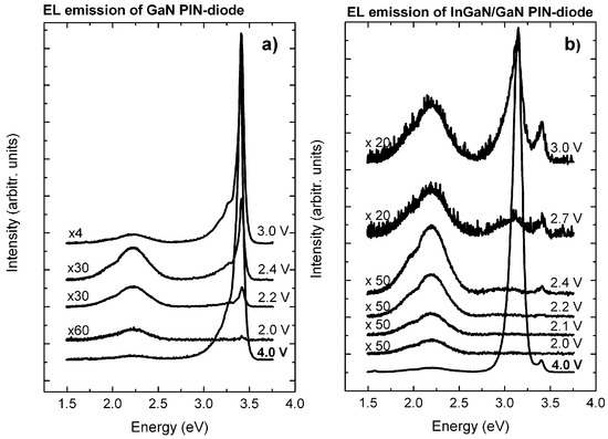 The quantum well layer of nominal thickness 9.5 nm InGaN in InGaN/GaN and 4 nm InAlN in InAlN/GaN is sandwiched between two intrinsic GaN layers (i-GaN); the total thickness of the intrinsic (unintentionally doped) region is 23 nm in both the DHS and the GaN reference. The composition of the InGaN and InAlN layers was obtained from high-resolution x-ray diffraction scans (HRXRD) of the (0002) reflection [44,45,46]. The adjacent n- and p-GaN layer sequences contain, at the n-side, on top of the (0001) sapphire substrate: n-doped GaN:Si layer (200 nm, 3 × 1018 cm−3), graded n-doped GaN:Si layer (100 nm, 1018–1017 cm−3), low n-doped GaN:Si layer (400 nm, 1 × 1017 cm−3); at the p-side: p-doped GaN:Mg (150 nm, 3 × 1018 cm−3) capped with highly p-doped GaN:Mg contact layer (10 nm, 1 × 1020 cm−3). Following the epitaxial heterostructure growth, PIN-diodes were fabricated by standard lithography and metallization techniques using Ni/Au as p-contact and Ti/Al/Ti/Au as n-contact [47].