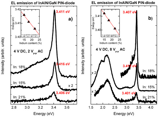 For the In0.055Ga0.945N/GaN field studied in this work, the flat-barrier condition is sustained for voltages below the emission threshold voltage of the respective PIN-diode of 4 V AC, as demonstrated in Figure 6. The field is maintained in the voltage-plateau 4–6 V, and is overwhelmed above 8 V, where FKOs are almost buried in the superimposed UV emission. In the inset of Figure 5, a fit of the electric field in dependence of voltage FB(V) with a straight line up to FB = 0 intersects the x-axis at a flat-barrier voltage of VFB = 8.47 ± 0.58 V. Using the built-in potential value selected at 0 V in capacitance-voltage measurements Vbi = 3.28 ± 0.22 V (part 3 Results and Discussion), since all equations were derived close to equilibrium [65], and du = 23.0 ± 2.0 nm (Figure 1b), the polarization field in the In0.055Ga0.945N/GaN DHS is found to be Epol = −2.26 ± 0.33 MV/cm in the same direction as the built-in field.