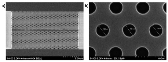 (a) Scanning electron microscope (SEM) image of the abricated photonic crystal (PhC) cavity. Length of the PhC cavity is approximately . (b) Close up of the holes in the PhC cavity. Hole diameter is measured to be nm.