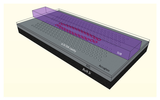 The DA PhC cavities are accessed by evanescent coupling through the polymer waveguide fabricated on top of them [16]; see Figure 2 for schematic. The highest coupling quality factor is obtained by interposing a thin spin-on-glass (SOG) between the a-Si cavities and the final polymer waveguide layer. This thin SOG layer is created by spin-coating the sample with Accuglass T11, a methyl-siloxane polymer containing 10% CH groups bonded to Si atoms in the Si-O backbone. The SOG layer is cured in an oxidation furnace with N atmosphere at temperature to minimum the thickness of nm for 1 h. To ensure future CMOS process temperature compatibility, SOG processing could be accomplished at [19]. The cured Accuglass is then etched back to the target thickness of nm in O plasma. The refractive index of the SOG layer is at nm [20]. The effect of the SOG layer is to enhance the mechanical stability of the PhC cavity and also to improve the symmetry of the PhC cavity mode.