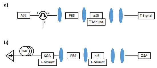 Optical characterization of the a-Si PhC cavities was performed using an end-fire measurement set up; see Figure 3 for schematic. To measure the optical transmission spectra of the PhC cavities a broadband Amplified Spontaneous Emission (ASE) source (Amonics ALS-CL-15-B-FA, https://www.amonics.com/product/39). was coupled to the polymer waveguide over the a-Si PhC cavity via a circulator, free-space optics and polarizing beam splitter. Light transmitted through the PhC cavity was collected from the polymer waveguide after propagation through the second lens system. Optical power was measured on a power meter and optical spectra were measured on an optical spectrum analyzer with a spectral resolution of . Temperature of the a-Si PhC cavity was maintained at by an external temperature controller.