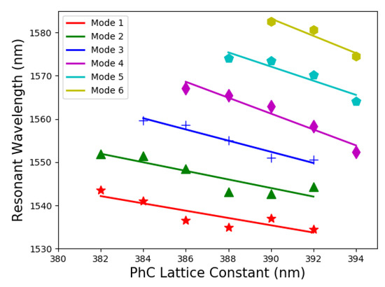 Measured resonant wavelengths of the PhC cavity and their variation with PhC lattice constant spacing. For each of the modes it is observed that .