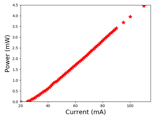 The power–current characteristic for the laser with lattice spacing of nm was measured using an optical power meter; see Figure 6. After correcting for the lens system insertion losses, approximately dB, the laser is seen to output optical power of for of current across the SOA, which is more than double the output power observed in a similar system reported in [15] where of output power was measured for of SOA current. The laser threshold current is approximately and is typical for lasers of this type; in [15] a threshold current of is reported. The slope efficiency of the laser above threshold is .