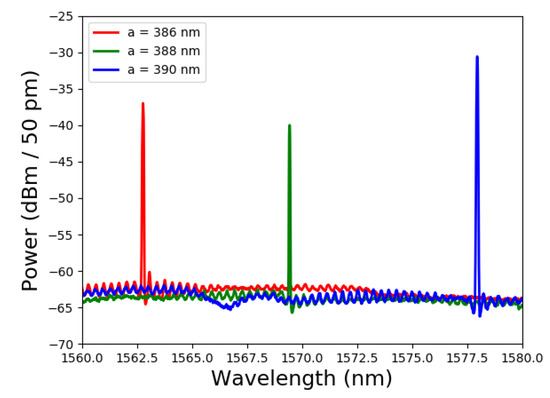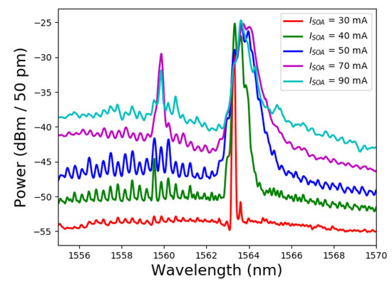 When the current increases further, the gain is so high that even other resonances with lower Q factors are in an over-threshold condition and all the cavity modes overlapping with these resonances start lasing. In particular, it can be seen that a PhC resonance of around , shown in Figure 4, starts lasing for SOA currents greater than .