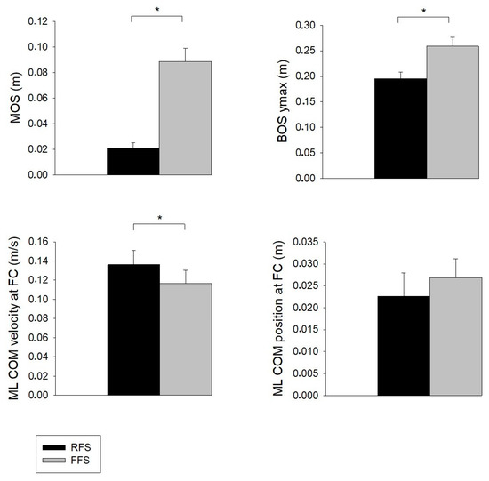 The ML margin of stability (MOS) at foot contact was significantly greater under the FFS than under the RFS condition (t12 = 6.12, p < 0.001), showing that ML dynamic stability at foot contact was increased under the FFS compared to the RFS condition (Figure 5). The results further show that the ML size of the base of support (BOSymax) was larger under the FFS than under the RFS condition (t12 = 4.77, p < 0.001), and that the ML centre of mass velocity at foot contact was lower (t12 = 5.75, p < 0.001). By contrast, the ML centre of mass position at foot contact was not significantly different between the two conditions.