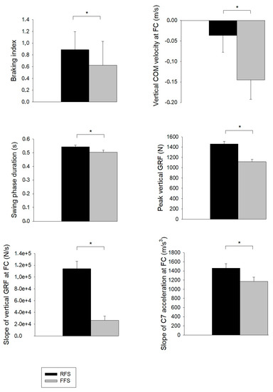 The peak value of the vertical ground reaction forces, which occurred shortly after foot contact and reflected the collision forces acting at the foot, was significantly smaller under the FFS than under the RFS condition (t12 = −5.61, p < 0.001), as was the slope of these forces (t12 = −5.11, p < 0.001; see Figure 6). In addition, the slope of the vertical acceleration (computed at foot contact) of the marker located at the C7 spine level was significantly smaller under the FFS than under the RFS condition (t12 = −2.32, p = 0.045).