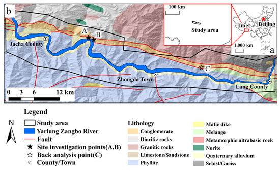 Lithologies in the study area are mainly dioritic rocks, granitic rocks, conglomerate, Lang County ophiolite melange rocks, phyllite rocks from north to south. The metamorphism grade of rock mass in the study area is gradually deepened from west to east, and the deformation is also gradually strengthened.