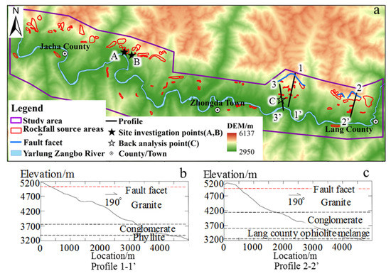The study area located at the YTSZ. Profiles in Figure 2b,c show that the fault facets are mainly distributed in the granite area within the elevation range of 4800–5100 m, with a dip direction of southwest and dip angle of 40°–55°.