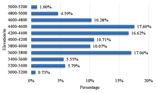 The altitude of the study area is between 3000 m to 5200 m (as shown in Figure 2), and the maximum relief is up to 2200 m, which is the alpine topography in plateau areas. This area crosses the Yarlung Tsangpo Structure Zone (YTSZ) and Gangdise-Nianqintanggula tectonic plate in a north-south direction, located at the north margin of the eastern section of the YTSZ, and adjoins with the southern edge of the Gangdise magmatic arc. Since the Miocene, the Indian plate has been subducting northward, and the Qinghai-Tibet plateau has been uplifted continuously, which lead to extremely strong tectonic activities in the study area. Many researchers have investigated the influences of tectonic activity on geohazards through geomorphological analysis, geophysical surveys, and finite-difference analysis etc., and proved that tectonic activity was one of the main factors impacting the slope stability [24,25,26]. The faults in the area are mainly distributed along the east-west direction, and the rest are distributed along the north-south direction. The famous Great Count Thrust (GCT) is distributed in parallel with the YTSZ from east to west [27]. Along the YTSZ, earthquakes over magnitude MS7.0 have occurred for many times, such as the MS7.7 earthquake in 1947 in the southeast of Nang County [28], and the MS7.0 earthquake in 1947 in Longzi County [29].