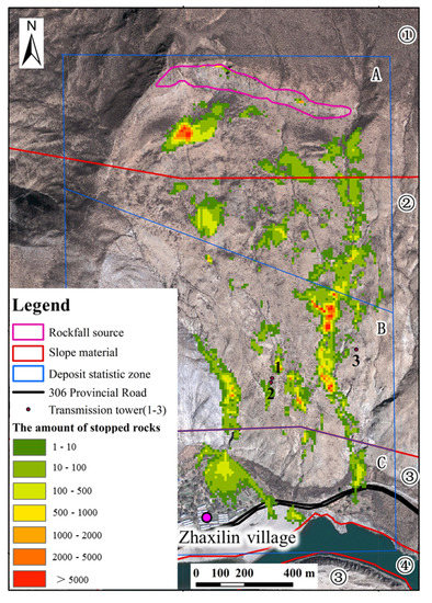 According to the lithology, roughness, and the vegetation coverage, the slope materials from the relief to the other side of the Yarlung Tsangpo River are divided into four categories (as shown in Figure 7). Subareas ①–④, respectively, correspond to the brittle rock zone, soft rock zone, quaternary alluvium zone, and the Yarlung Tsangpo River. For the whole study area, the brittle rock zone contains conglomerate and granite, while the soft rock zone contains phyllite and melange. Due to the accessibility limitation of the back analysis area, we use conglomerate and phyllite to obtain the parameters of the brittle rock area and the soft rock area, respectively. The selected size of falling block is based on the statistical analysis result of the size of deposited blocks around the slope. The mean size is taken as 4 × 3 × 3 m3, and the size variation range is ±20%. The shape is set as cuboid, and the density of rock mass is set as 2800 kg/m3 considering the experimental data of conglomerate and granite rocks. In Figure 7, there are 553 grids in the source area. The calculation is set for 1000 times, which means 5.53 × 105 blocks are thrown down. Using Rockyfor3D numerical simulation software, based on the distribution of deposited blocks on the slope surface, the parameters for 3D rockfall simulation were back analyzed. It was calculated that the deposited numbers of blocks in the three regions A, B, and C in Figure 7 account for 34%, 61%, and 5% of the total amount of thrown blocks, respectively, which was in line with the distribution characteristics of deposited blocks observed on site. It is considered that the selected parameters were reasonable. The parameters of slope materials obtained by back analysis are shown in Table 1.