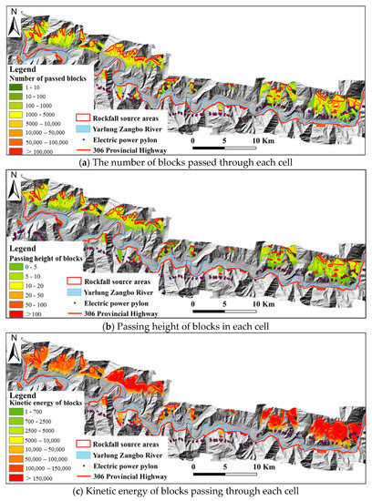 Based on the parameters obtained by back analysis and the source areas obtained by the semi-automatic approach, the kinematic characteristics of rockfalls from Nang County to Jiacha County were simulated and analyzed. The results are shown in Figure 8.
