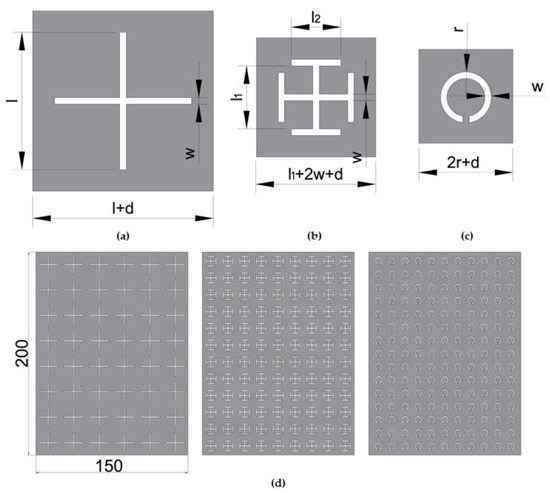 Evaluated metasurface unit elements with the following geometric parameters: (a) complementary cross, (b) complementary Jerusalem cross, (c) complementary split-ring resonator, and (d) designed metasurfaces (dimensions in mm; the gray color is the copper cladding, the white color is the lack of copper cladding).