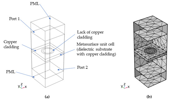 Numerical model of a metasurface: (a) model geometry and description and (b) computational mesh shown on the selected model boundaries.