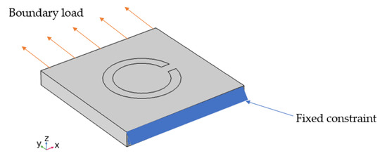 One of the analyzes carried out as part of the experiment concerned the impact of the surface deformation caused by the external mechanical forces. In this case, one of the side unit cell boundaries was fixed in x,y,z space, while the opposite one was loaded with an external force, as it is presented in Figure 3. First, the mechanical problem was solved and the deformed geometry was obtained. Next, the high-frequency electromagnetic problem was solved, based on the previously achieved deformed geometry. The equations solved during numerical the analysis are as follows [26]:
