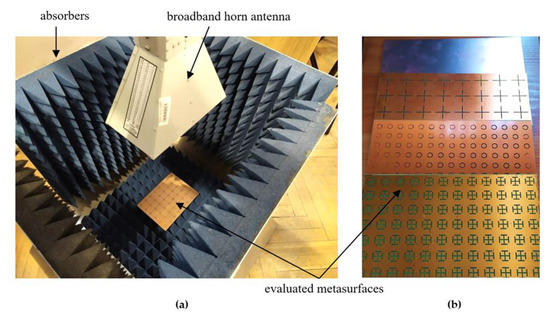 Experimental setup for metasurfaces measurements: (a) photo of test stand and (b) photo of exemplary metasurfaces and reference conductive plate.