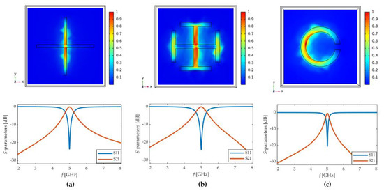 The exemplary results of the simulations are presented in Figure 5. As was expected, the electric field was distributed only in the vicinity of the structural elements, where the copper layer was removed during the etching process. Based on the presented frequency responses of the scattering parameters, it is clearly visible that similar operating conditions were obtained in the case of all of the evaluated structures. The achieved resonant response was more selective in the case of the SRR.