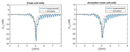 The comparison of the resulting reflection coefficient |s11|obtained using numerical simulations and measurements is shown in Figure 6 for the selected MS structures. One can observe the good agreement. The resonant frequencies in both cases were very similar (the difference is less than 75 MHz), as well as the amplitudes in resonance (the difference of about 3 dB). The frequency responses obtained as a result of the calculations have standard, smooth shape characteristics for the resonance curves. In the case of the frequency responses obtained through the measurements, one can observe periodic oscillations caused by calibration errors during the de-embedding procedure. The agreement between the results of the simulations and measurements proves the correctness of the metasurface design procedure and numerical models. This means, the assumptions made during the modeling process, like the application of plane wavefront and Floquet-periodic boundary conditions, are valid and appropriate. Thus, the developed numerical models can be used for further analyses.