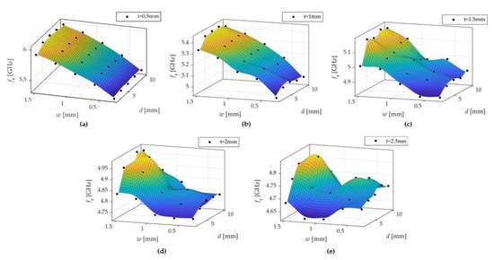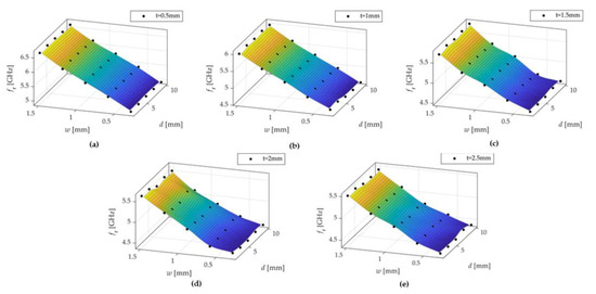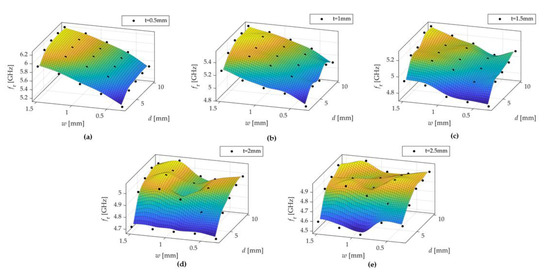 Resonant frequency, fr, distribution as a function of slot width, w; resonator to resonator distance, d; and dielectric laminate thickness. t, in cases of split ring resonator (SRR) cell geometry: (a) t = 0.5 mm, (b) t = 1.0 mm, (c) t = 1.5 mm, (d) t = 2.0 mm, and (e) t = 2.5 mm.