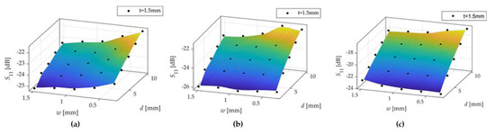 Reflection coefficient modulus in the resonance state |s11(fr)| distribution as a function of slot width, w; and resonator to resonator distance, d, in cases of dielectric laminate thickness t = 1.5 mm: (a) cross cell geometry, (b) Jerusalem cross cell geometry, and (c) split-ring resonator cell geometry.
