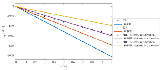 The next experiment concerned the mechanical excitation caused deformations. The results of this numerical analysis are shown in Figure 11. As was mentioned in the previous paragraph, metasurfaces were subjected to external stress in x- and y-directions, separately. The application of stress in an x-direction caused an extension of all of the geometric parameters in an x-direction, and a decrease in the y- and z-direction. Similarly, the application of stress in the y-direction (see Figure 3) caused an extension of all of the geometric parameters in a y-direction, and a decrease in the x- and z-directions. Influence of mechanical excitation on the behavior of the evaluated metasurfaces was also analyzed using fr and |s11(fr)| values. In the case of the CR and the JCR structures, because of their symmetry in orthogonal directions, these were the same results in the case of x- and y-direction stress application. In the case of the SRR cells-based material, there were various responses for various directions of mechanical excitation. Generally, in the case of all of the evaluated structures, there was a linear dependence between strain and resulting resonant frequency fr (operation in the linear range of stress–strain curve). The slope of the linear function depends on the metasurface structure. The highest sensitivity to mechanical excitation was for the CR structure, while the lowest sensitivity had the SRR stressed in the y-direction. The high sensitivity of the CR structure, in this case, may seem to contradict the result of the previous experiment (regarding the change of parameters w, d, and t), where the CR structure was stable and relatively a little dependent on the changes in geometry. However, it should be noted that (as already mentioned), in the case of stretching, the geometry changed in a completely different way than in the first experiment. When stretching the CR structure in an x-direction, there was an elongation (increase of l) and narrowing (decrease of w) of the cross arm parallel to the x-axis, and at the same time a shortening (decrease of l) and extension (increase of w) of the cross arm perpendicular to this axis. This operation was significantly different from, for example, increasing the width of both arms (changing the parameter w) from the previous experiment. This allowed us to state that the analysis of the metasurfaces’ susceptibility to geometry changes should be performed concerning specific applications and the resulting restrictions/parameters. Thanks to the consideration of the relative strain (in [%)), the influence of various dimensions of unit cells was minimized. Additionally (not shown in any Figure) the effect of the external mechanical excitation in the presented range had a negligible influence on the module of the reflection coefficient in the resonant state |s11(fr)|.