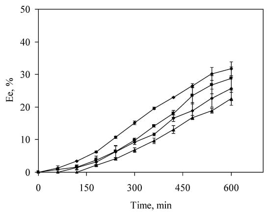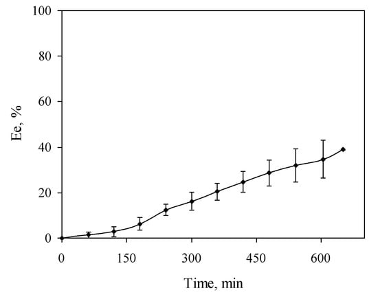 Temporal variation of extraction efficacy. Aqueous solution: 100 µg·L−1 Ni2+, pH = 8, 35 g·L−1 NaCl. Receiving solution: 1.3 mol·L−1 HCl. Organic solution: 0.89 mmol·L−1 1,2-CHBBH. Stirring rate: 500 rpm.