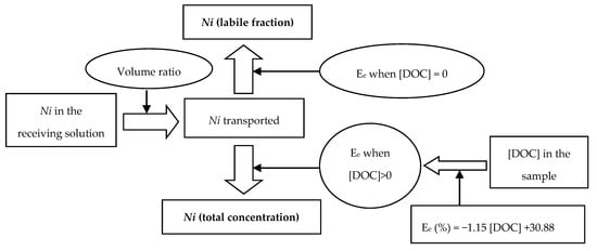 Then, the extraction efficacy calculated from the DOC concentration using Equation (3) allows the quantification of total nickel concentration in a similar way. Finally, the non-labile fraction may be estimated by the subtraction of total and labile fractions.