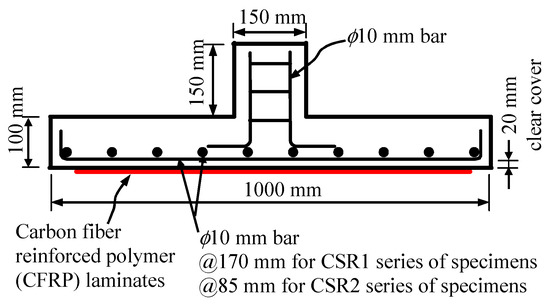 Twelve specimens were constructed and tested to failure. The specimens were a 1000 mm square concrete slab of 100 mm thickness, with a stub column of 150 mm square cross section at the center of the slabs. The stub column was cast monolithically with the slab. Figure 1 shows the details of the test specimens. The design variables of the specimens were the compressive strength of concrete, ratio of tension steel reinforcement, and the amount of the CFRP laminates. Table 1 presents the specimens test matrix. The CSR1 and CSR2 symbols used for the specimen designation stand for the different amount of the tensile steel reinforcement. Concrete slabs were reinforced with Grade 60 deformed 10 mm diameter (No. 3) bars at an equal spacing of either 170 or 85 mm along both directions of the slab, resulting in 0.6% (CSR1 series) and 1.2% (CSR2 series) ratio of steel reinforcement, respectively. The C1 and C2 symbols represent the specified compressive strength of the concrete that was 14 and 28 MPa, respectively. The last symbol indicates the number of layers of the CFRP laminates.