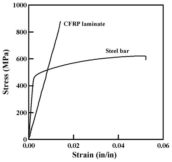 Material tests were carried out to determine the compressive strength of concrete and yield and tensile strengths of the steel reinforcing bar. While the specified compressive strengths of concrete designed for two series, C1 and C2, of the specimens were 14 and 28 MPa, the compressive strengths of concrete tested from the cylinders during the time of the test of the slabs resulted in average values of 18.2 and 27.6 MPa, respectively. The tensile strength test of the 10 mm dia. steel reinforcing bar showed that the yield and tensile strengths were 500 and 630 MPa, respectively. Figure 3 shows typical stress-strain curves of the CFRP laminates and steel bar used in this study.