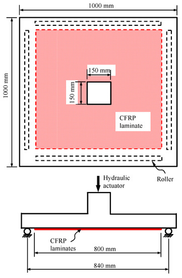 The carbon fiber has very high tensile strength compared to other fibers, such as glass fiber or aramid. The property of the raw material of carbon fiber used in the test has a tensile strength of 3920 MPa, certified by the supplier. The unidirectional carbon fabric weights 300 g/m2. A two-component epoxy matrix was used. Carbon fabric composite used in this study had a fiber volume content of 40%, which showed good processing ability in hand lay-up. Figure 2 shows the lamination of the CFRP laminates. A single layer of the laminate means that the unidirectional carbon fabric sheets were laminated once in both directions of the slab. The CFRP laminates were externally bonded on the tension side of the concrete slab, within a square of 800 mm in the central area of the slab. A column may exist on the tension side of the slab in practice. The laminates need to avoid the column zone. To effectively bond the CFRP laminates, the tension side of concrete surface was properly abraded to a rough surface before applying the primer. Carbon fabric sheets were then laminated to the surface using two-part epoxy after the primer was cured. To determine the tensile strength of the CFRP laminates, the CFRP laminates were tested according to ASTM D3039 test method [13]. The mechanical properties of the CFRP laminates are tabulated in Table 2.