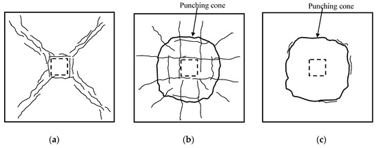 Typical cracking patterns on the tension surface of the slab: (a) Flexural failure; (b) Punching shear failure of slabs without CFRP laminates; (c) Punching shear failure of slabs with CFRP laminates.