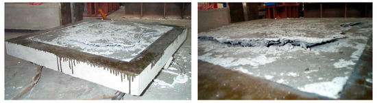 Failure of the remaining specimens was clarified as the punching shear failure because the stub column suddenly punched through the slab at failure, accompanied by much smaller deflection of the slabs compared to that of the specimens failed in flexural. The load-carrying capacities dropped in a second when punching shear failure occurred. For those CFRP-strengthened specimens, there was no damage or debonding of the CFRP laminates at their ultimate loads, even though the laminates did not have a special anchor. After the slabs reached their ultimate loads, the CFRP laminates were gradually debonded starting from the vicinity of the crack surface when the stub column was pushed further. After the test, the laminates were peeled to examine the crack surface that was near a circle with approximate diameter of 360 to 600 mm, as shown in Figure 6. Typical cracking patterns of the slabs failed in punching are shown in Figure 5b,c. For the CFRP-strengthened specimens, there was no cracking within the truncated cone due to the strengthening of the laminates (Figure 5c), while the specimens CSR2-C1-F0 and CSR2-C2-F0 (without laminates) displayed more cracking within the truncated cone (Figure 5b).